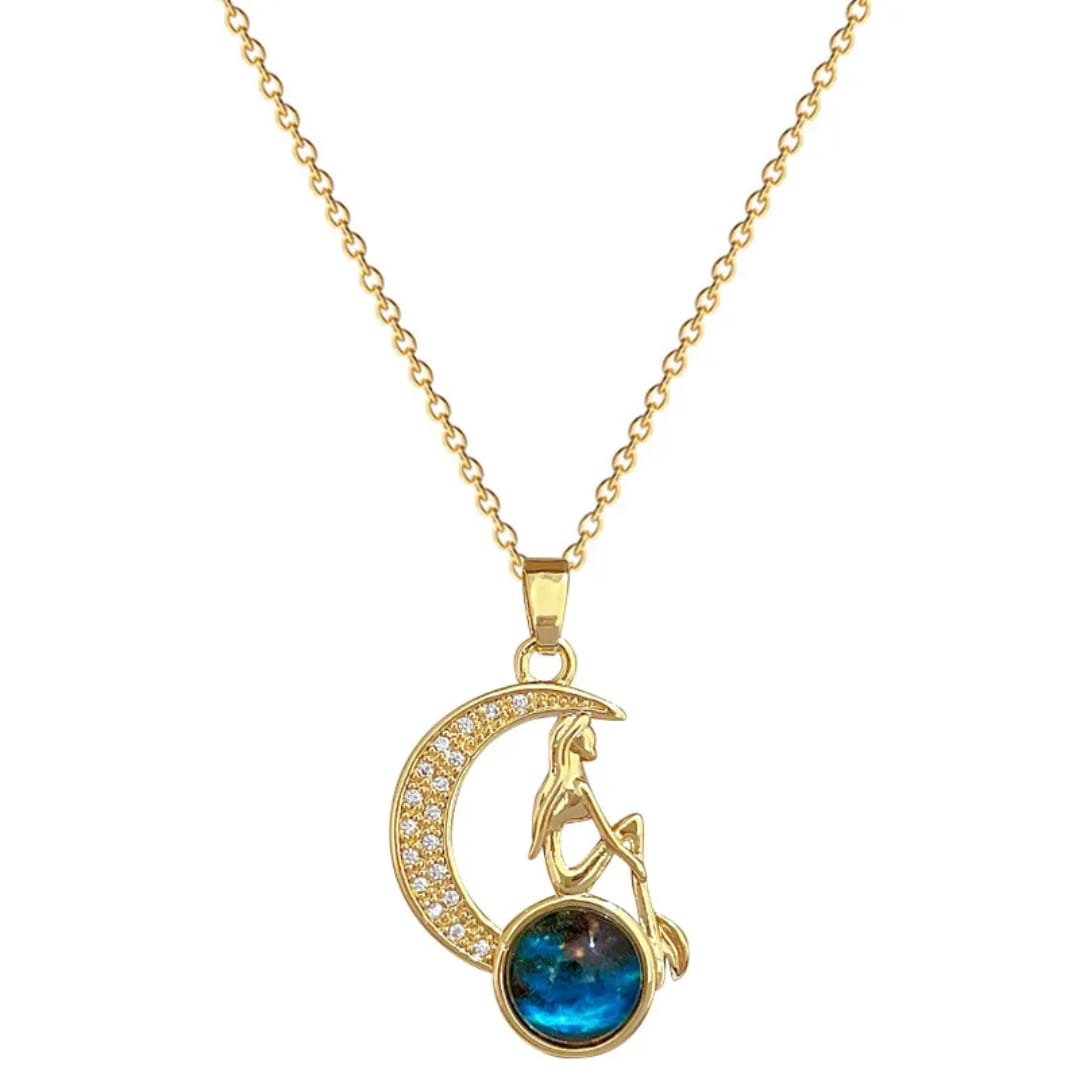 Collana con ciondolo mezza luna, sirena e diamante blu in acciaio inox